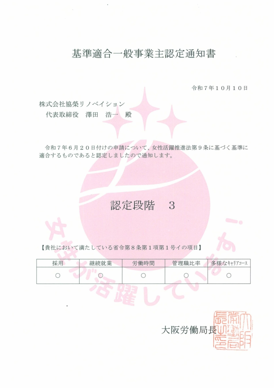 このたび弊社は、厚生労働省より「えるぼし認定(3段階目)」を取得いたしました。