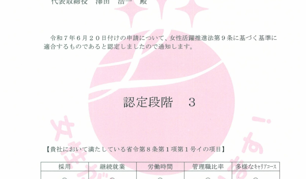 えるぼし認定(3段階目)を取得しました