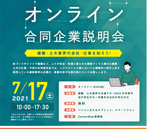 HOME > インフォメーション > Career Map様主催の「建設業界オンライン合同企業説明会」に参加します。